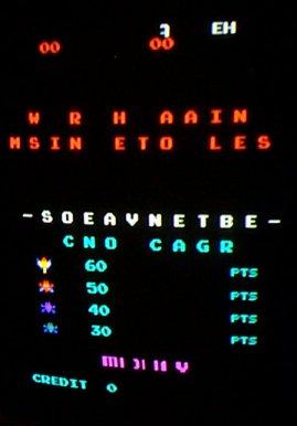 This one passed the memory test on bootup (most of the time), but consistently missed out certain letters on the screen display. Even odder, the missing letters seemed to sometimes appear on the top line of the screen. Phil had already replaced pretty much every chip to do with address decode, buffering and selection, but it still had the same problem. Using the 'video probe' (as mentioned in the Galaxian troubleshooting guide) I looked at the various signals used to control the video memory lockout. CMP BLANK is used to control the address selection to the 2114's, and that looked fine, VBLANK (used in the vram control) also looked normal. The only signal that looked slighty odd was HBLANK - I compared this against a working board and it looked to be enabled for about 8 pixels longer - this reduced the size of the buffer to allow writes to complete before the video started drawing. Following this back to 3D (7474) still had the problem, checking the signals into 3D revealed that one signal was very weak. replacing the chip at 3C (7420) fixed the problem.