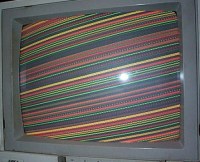 Screen filled with coloured lines, unstable, no sync (see above) check clock signals from horizontal and vertical scan generators (74161s at 2R,2S,3R,3S) no signal feeding into pin 2 of horizontal generators. Follow trace back to 7474 at 3N, signal going in, nothing coming out replace chip and screen display back to normal.