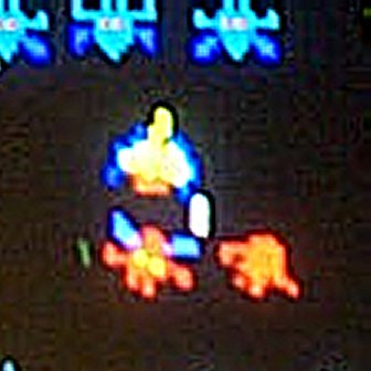 On a bootleg PCB, the diving triad of ship and galaxians, the right hand galaxian had no eye's or wings. The sprite ram was OK, and no other galaxians had similar faults. I eventually tracked the problem down as something to do with the 7400 at 2P. When I placed the probe on pin 1 or 5, the eyes reappeared, as did a thin section of the wing. I replaced this chip with a 74LS00, hoping the lower power requirement would help out, but it made little difference. The bootleg board did not match the midway schematics at this point, and instead of the output of the sprite rams being buffered, they were driving the chip directly. There was also a pull up resistor on the output, so I removed this - problem solved! (incidentally, this particular sprite ram had been replaced as it was a different brand to the other 4, so maybe the originals had more drive power)