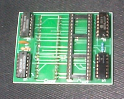 This shows the top of the board. visible are the logic chips used to do the necessary combination and other changes to control lines, and the socket where the Z80 fluke plugs in. To make it more rubust for continued use, I will probably fit a 40 pin ZIF socket into this socket at some point.